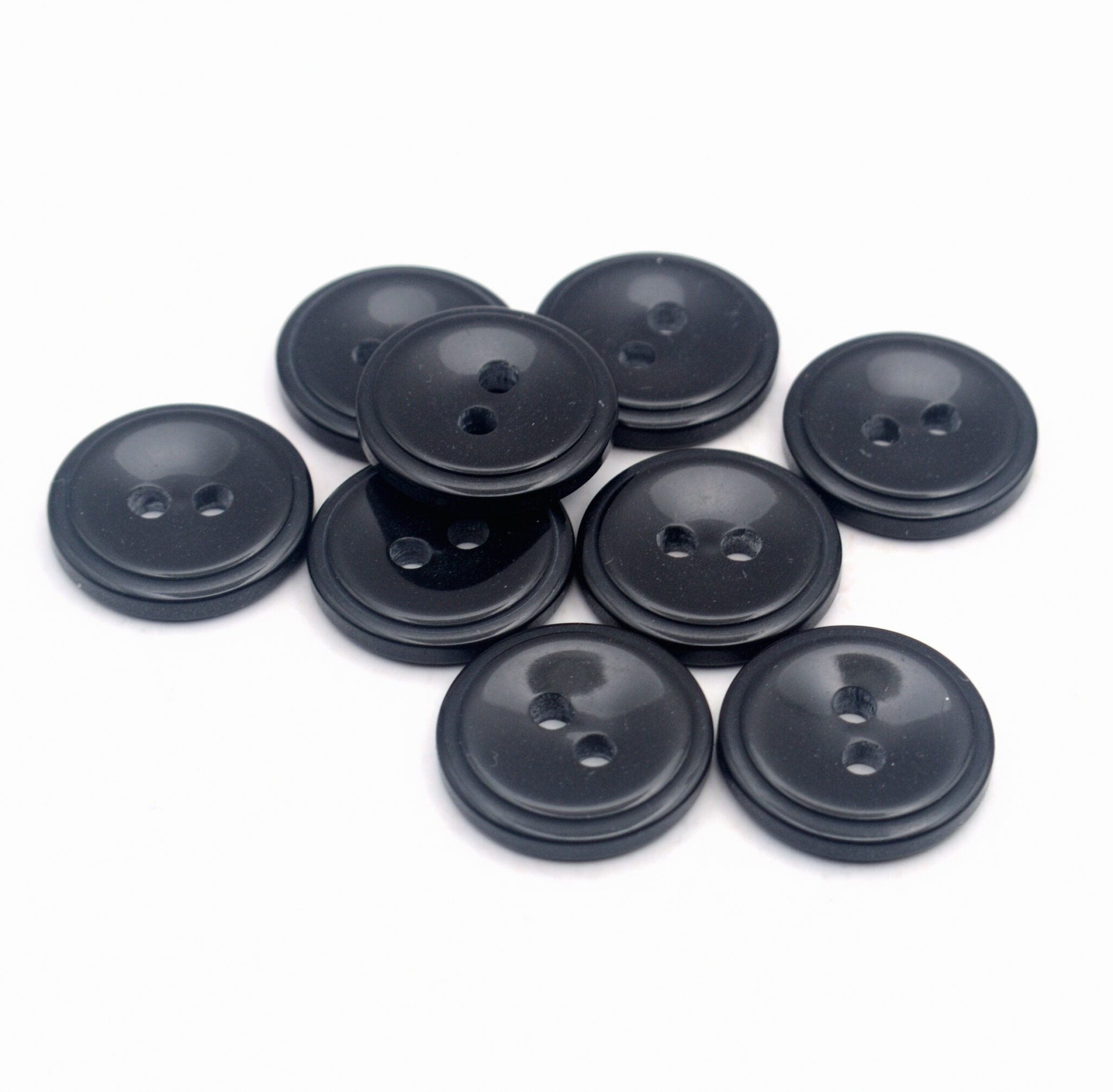 Black Double rim button with 2 holes for sew through fastening. Made from polyester with a glossy finish. Very slightly concave surface sitting on a larger base – creating a double rim effect.