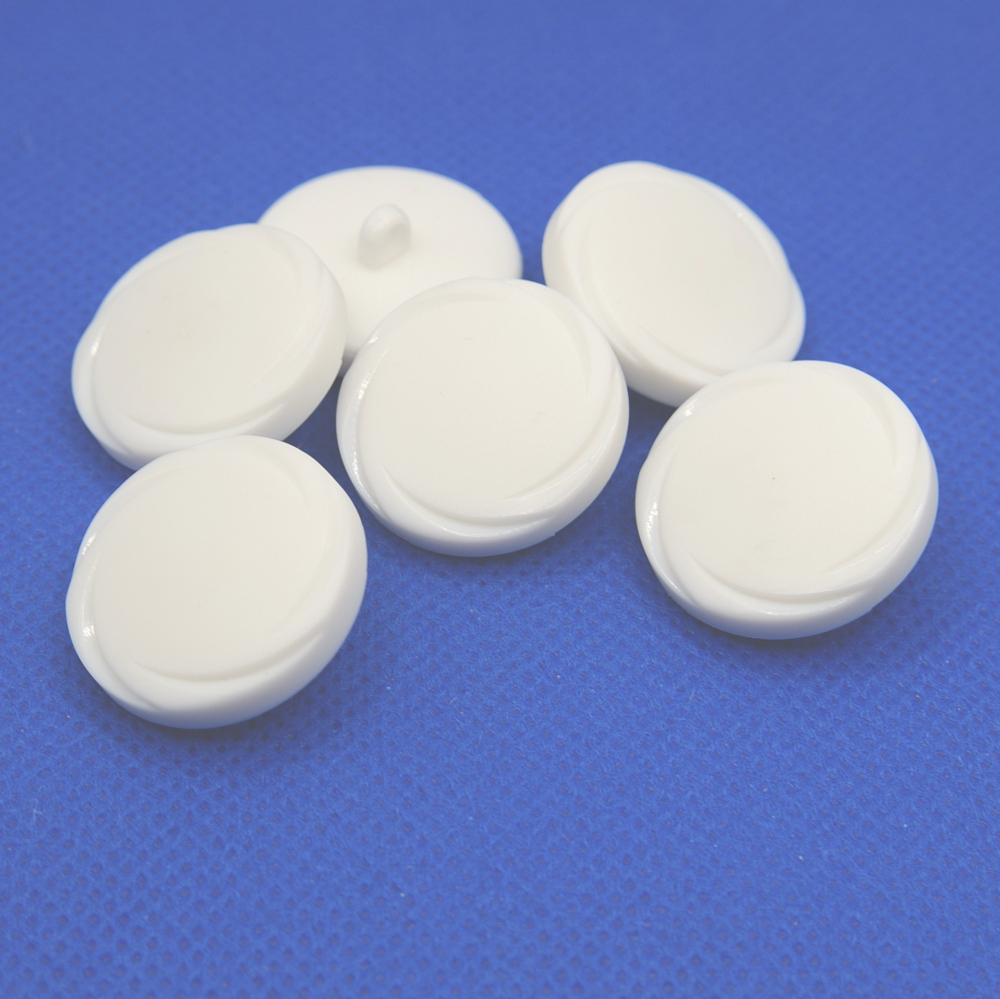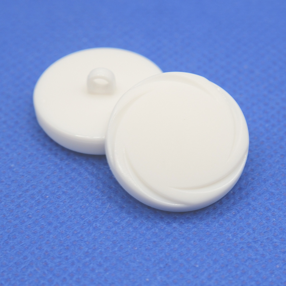 Matt White buttons with a rear shank for fixing. Made from duruable nylon. The button has a modern, understated design with a smooth, uninterrupted front surface that emphasises simplicity and functionality. Around the outer edge, there is a subtle recessed curve that creates a delicate frame effect, adding visual interest without distracting from the clean overall look.