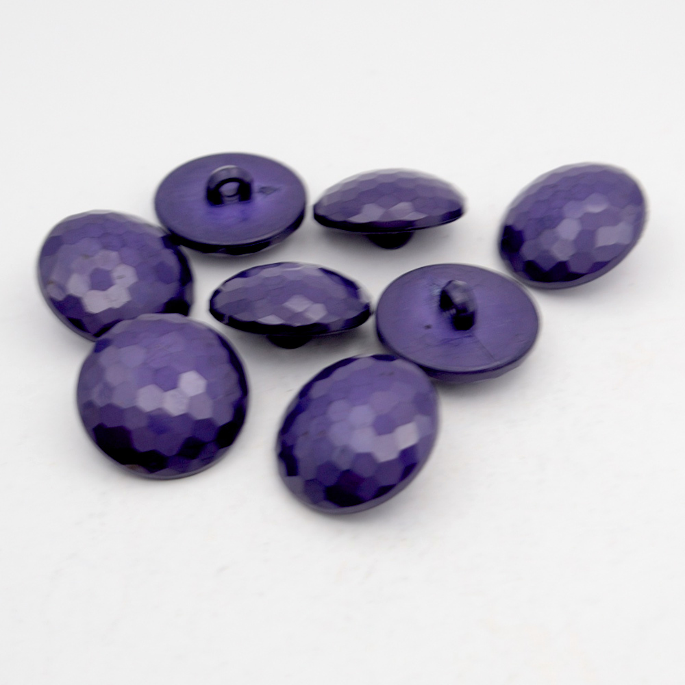 Purple faceted domed buttons with a rear shank for fixing. Quality nylon buttons with a glossy finish, featuring a faceted surface with a slightly domed shape. They have a depth of approximately 7mm (excluding the shank).